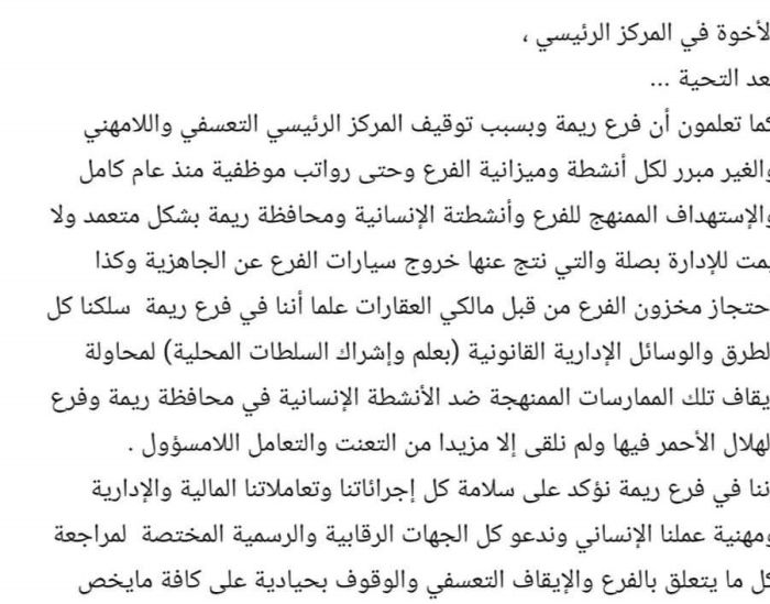 الهلال الأحمر اليمني في ريمة يؤكد توقف العمل في المركز ونهب ميزانيته منذ أكثر من عام