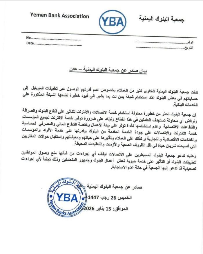 جمعية البنوك اليمنية تحذر من "قيود خطيرة" تفرضها شبكة (يمن نت) على الخدمات المصرفية