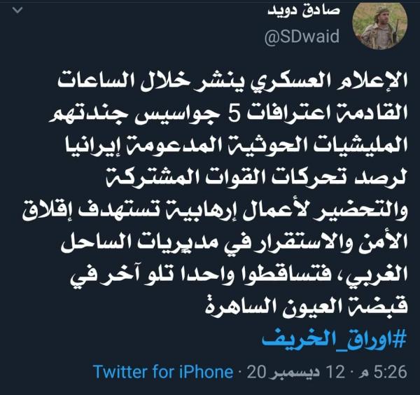 الإعلام العسكري يبث اعترافات 5 جواسيس جندتهم مليشيا الحوثي في جبهة الساحل الغربي