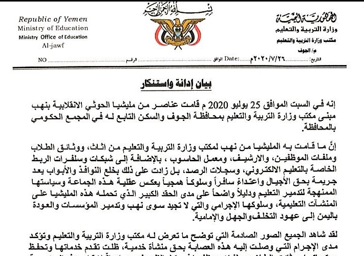 التربية تدين نهب ميليشيا الحوثي لمكتبها بالجوف