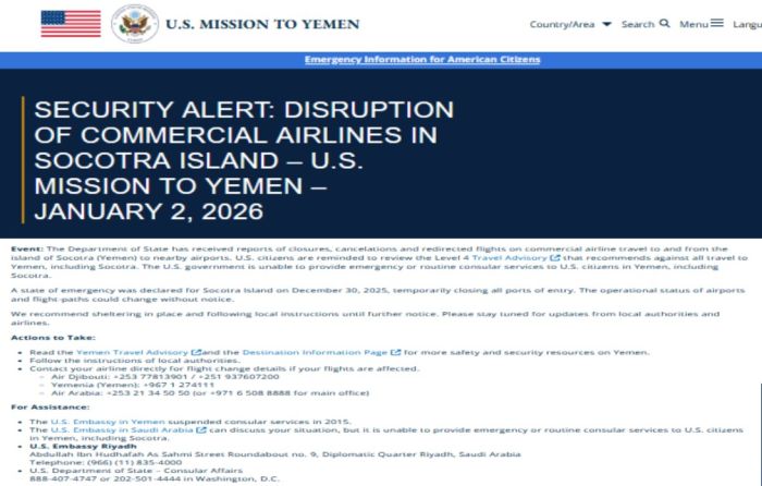 U.S. advises US citizens against travel to Yemen and Socotra Island