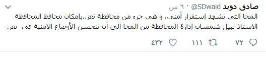 العميد دويد : المخا جزء من تعز وبامكان المحافظ إدارة المحافظة منها