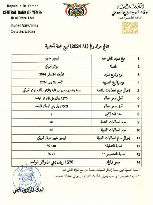 البنك المركزي يعلن عن بيع 40 مليون دولار بسعر 1570 للدولار