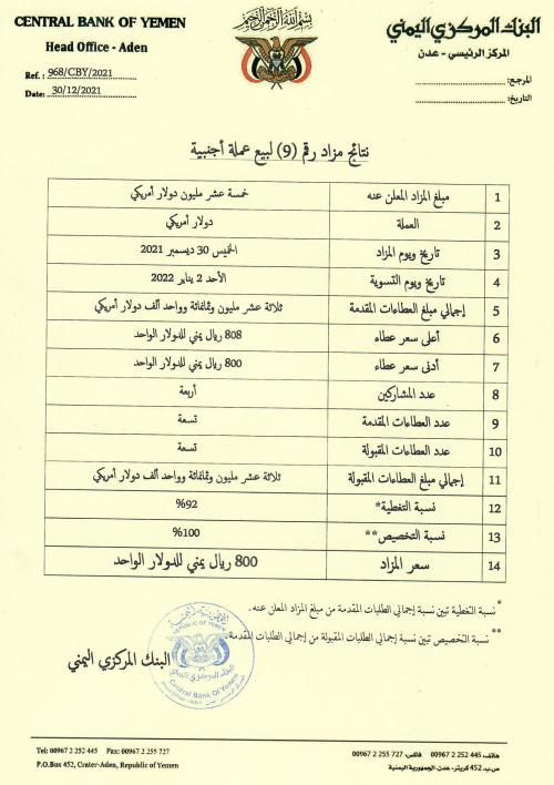 إعلان نتائج المزاد التاسع لبيع الدولار الأمريكي