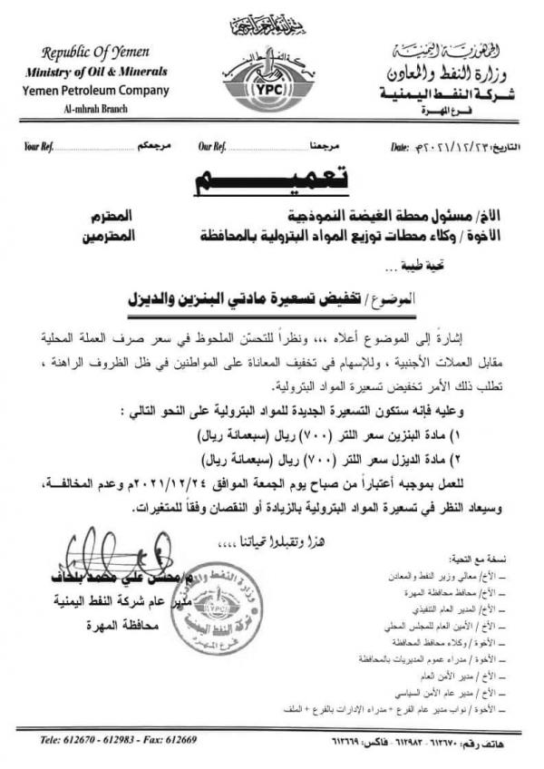 المهرة : الإعلان عن تخفيض طفيف في أسعار المشتقات النفطية