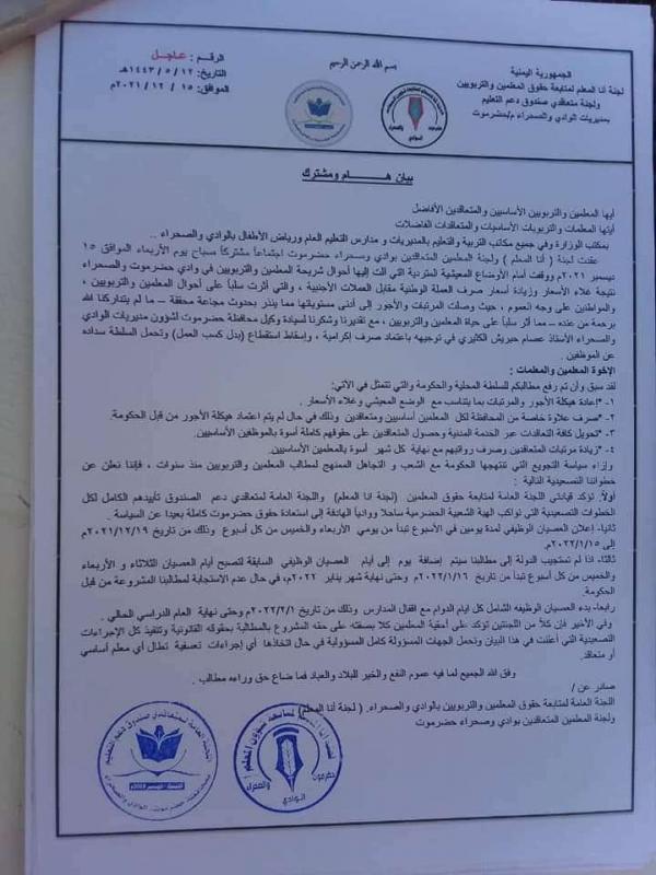 حضرموت : إضراب جزئي للمعلمين والمعلمات لتردي الوضع المعيشي