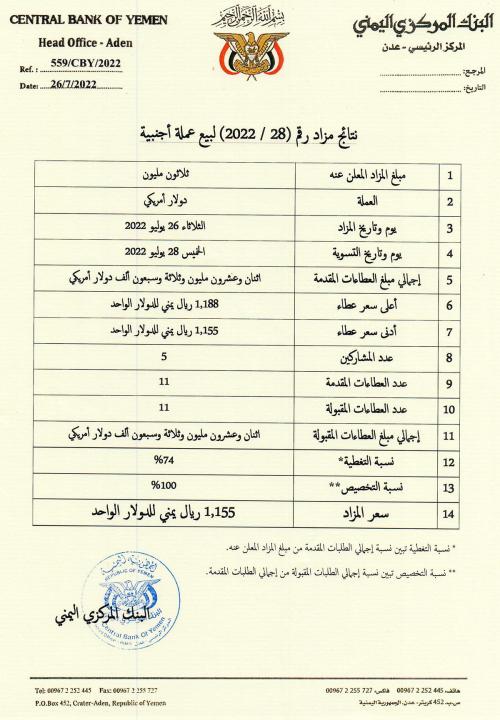البنك المركزي يعلن نتائج المزاد رقم 28 بـ 1155 ريالاً للدولار