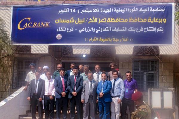 دشن مسؤولون حكوميون ومحليون، اليوم الأحد، أنشطة فرع بنك التسليف التعاوني الزراعي "كاك بنك" في مديرية المخا الساحلية، غرب محافظة تعز، في ظل حالة الأمن والاستقرار التي تشهدها المديرية، وتعاون القوات المشتركة والسلطة المحلية في إعادة تطبيع الحياة في المديريات المحررة في الساحل الغربي، بعد طرد مليشيا الحوثي منها.