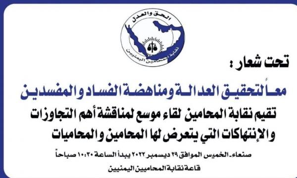 وكانت نقابة المحامين اليمنيين قد دعت منتسبيها لحضور اللقاء الموسع صباح الخميس ابتداءً من الساعة العاشرة والنصف صباحاً، في قاعة النقابة الكائنة في شارع الرقاص أمام محطة العبور (المفزر)، لمناقشة تصاعد الاعتداءات والانتهاكات التي تطالهم في المناطق الخاضعة لسيطرة ميليشيا الحوثي الارهابية الموالية لإيران.