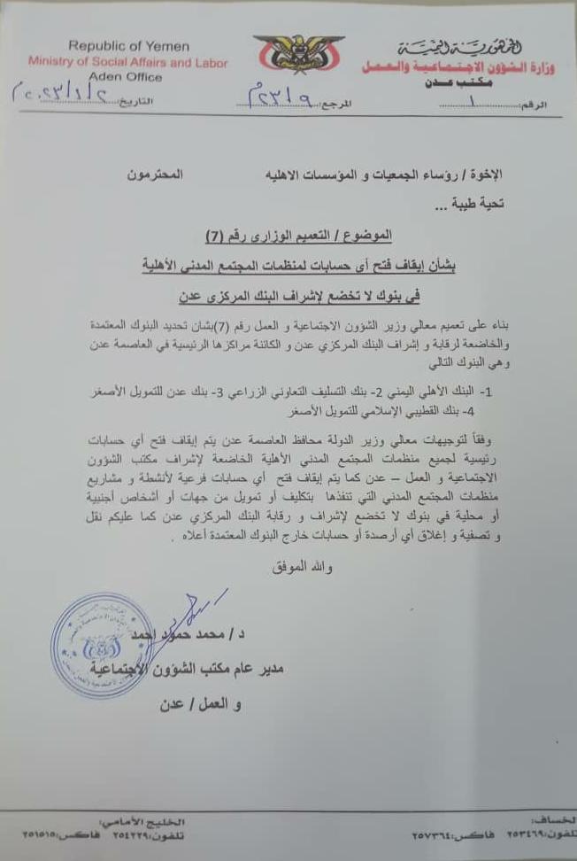 وخاطب التعميم جمعيات ومؤسسات المجتمع المدني الخاضعة لإشراف مكتب الشؤون الاجتماعية والعمل في العاصمة المؤقتة عدن، بإيقاف فتح أية حسابات رئيسة، وإيقاف فتح أي حسابات فرعية لأنشطة ومشاريع منظمات مجتمع مدني تنفذها بتكليف أو تمويل من جهات أو أشخاص أجنبية أو محلية في بنوك لا تخضع لإشراف ورقابة البنك المركزي في عدن.