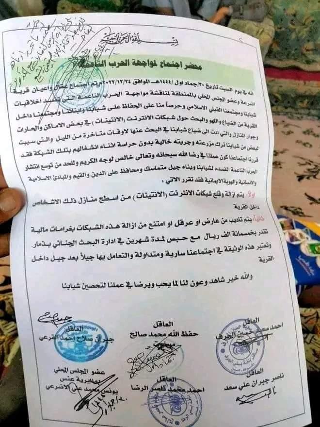 وتداول ناشطون وثيقة قدمها أعيان وشخصيات موالية للميليشيا الحوثية وصادق عليها مدير مديرية عنس التابع لها "يونس الأضرعي"، على "إنزال وقلع شبكات الانترنت (الانتينات) من أسطح المنازل داخل قرية "أضرعه"، وتأديب من يعارض أو يمتنع عن إزالة الشبكات بغرامة مالية خمسمائة ألف ريال والحبس شهرين في إدارة البحث الجنائي بمحافظة ذمار".