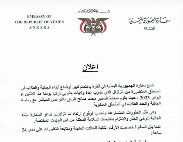 دعت السفارة اليمنية في العاصمة التركية أنقرة، أبناء الجالية اليمنية لتوخي الحذر والالتزام بتعليمات السلامة الصادرة عن السلطات التركية، وسط أنباء عن فقدان طلاب وعائلات يمنية تحت الأنقاض جراء الزلزال الذي ضرب تركيا اليوم الاثنين.