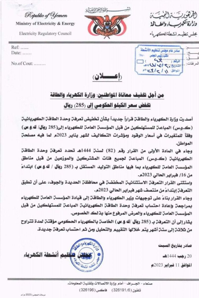 وعممت تعرفة الطاقة المباعة لجميع فئات المشتركين والموزِّعين في مناطق مؤسسة الكهرباء؛ بمافيها مناطق التوليد المستقل بـ 285 ريالا ابتداء من منتصف فبراير.