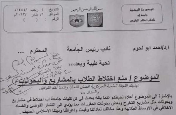 وقالت مصادر أكاديمية، إن ميليشيا الحوثي، وجهت بمنع البحوث المشتركة بين الطلاب والطالبات، بمختلف الأقسام والكليات داخل جامعة إب.