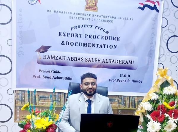 حصل الباحث اليمني حمزه عباس الحضرمي على درجة الماجستير بتقدير ممتاز من جامعه الدكتور بابا صاحب الحكوميه بولايه اورانج اباد الهنديه، عن رسالته الموسومة ب: “ اجراءات التصدير والوثائق الدوليه”.