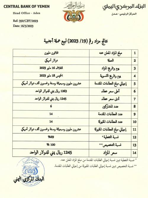 ووصل إجمالي مبلغ العطاءات إلى 20.75 مليون دولار وأعلى سعر عطاء عند 1263 وأدنى عطاء بـ 1245 ريالا بإجمالي 14 عطاء.