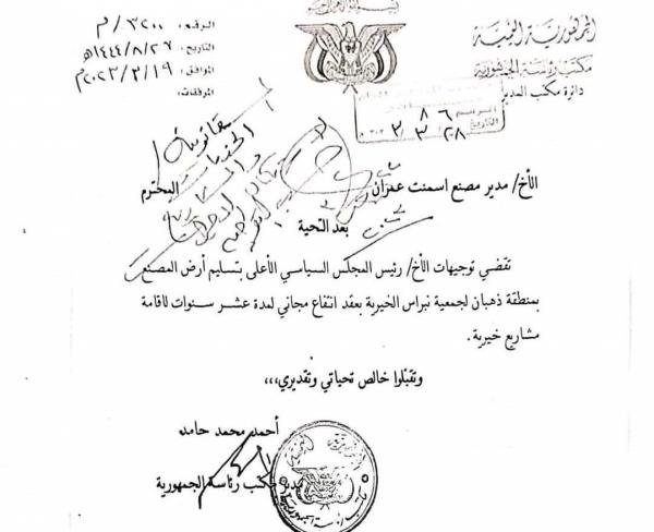 وطبقا لوثيقة سرية مسربة، وجه القيادي الحوثي أحمد حامد المعين في منصب مدير مكتب الرئاسة، مدير مصنع أسمنت عمران بتسليم أراضيه إلى الجمعية الوهمية التي تتبع توفيق المشاط وتحمل اسم جمعية نبراس الخيرية.
