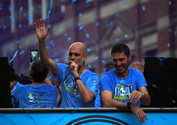 خطف بيب جوارديولا، مدرب فريق مانشستر سيتي، الأنظار خلال ظهوره في حافلة فريقه التي تجوب أرجاء مدينة مانشستر، للاحتفال بالثلاثية التاريخية التي حققها النادي.