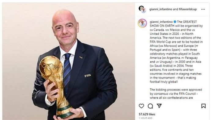 ونشر إنفانتينو صورة عبر حسابه على موقع التواصل "إنستجرام"، قال فيها: "سيتم تنظيم أعظم عرض على الأرض من قبل كندا المكسيك والولايات المتحدة في عام 2026 - في أمريكا الشمالية".