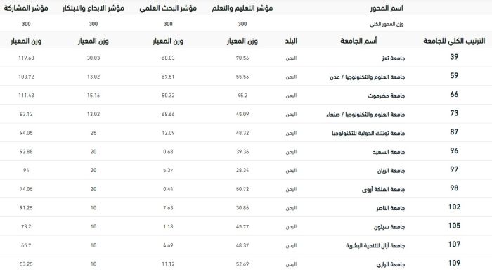 وغابت عن المشاركة في التصنيف جامعات حكومية كبرى كصنعاء والحديدة الخاضعتين لسيطرة ميليشيا الحوثي.