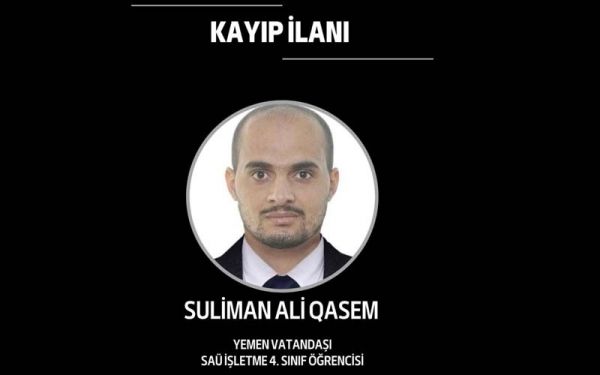 وقال الاتحاد في بلاغ على حسابه بمنصة فيسبوك، "إن الطالب سليمان علي محمد علي قاسم، طالب في جامعة سكاريا، قسم إدارة الأعمال، سنة رابعة مفقود منذ يوم الاثنين الماضي حيث رصدت كاميرات المراقبة الطالب وهو عائد إلى منزله الكائن في شارع الجامعة".