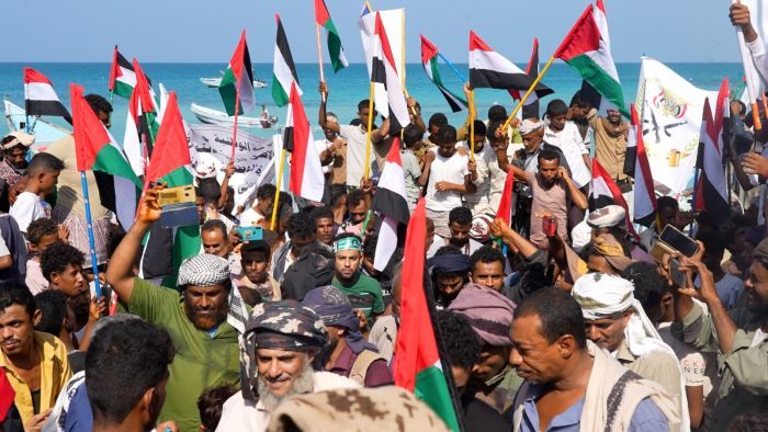 وأكدوا في البيان الصادر عن الوقفة، موقف الشعب اليمني الثابت تجاه القضية الفلسطينية، ورفضهم المزايدة والمتاجرة بها من قِبل أدوات إيران لخدمة أجندة طهران في المنطقة وعلى حساب أمن دول المنطقة والملاحة التجارية في البحر الأحمر.