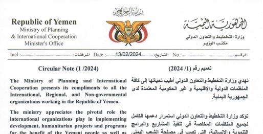 ودعت الوزارة، في تعميم لها إلى أهمية نقل المقرات الرئيسية للمنظمات الدولية والإقليمية وغير الحكومية المعتمدة لدى اليمن إلى عدن وفتح حساب مصرفي لدى البنك المركزي بعدن.