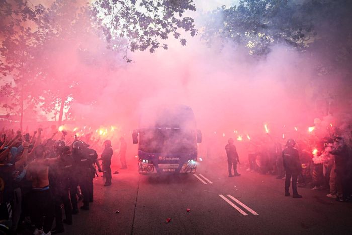 واحتشدت جماهير برشلونة أمام الملعب لاستقبال الفريق، وحملوا لافتات ضد نجوم باريس سان جيرمان وتحديدا عثمان ديمبيلى نجم النادى الفرنسى ولاعب الفريق السابق الذى سجل واحتفل فى مباراة الذهاب.