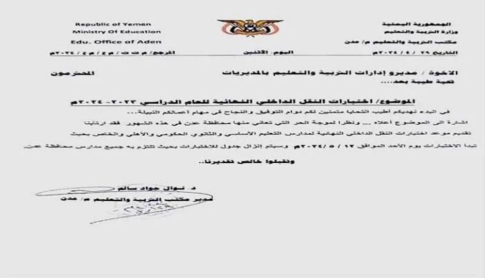 وقال مكتب التربية في عدن نظرا لموجة الحر التي تعاني منها محافظة عدن في هذه الشهور فقد ارتأينا تقديم موعد اختبارات النقل الداخلي النهائية لمدارس التعليم الأساسي والثانوي الحكومي والأهلي والخاص.