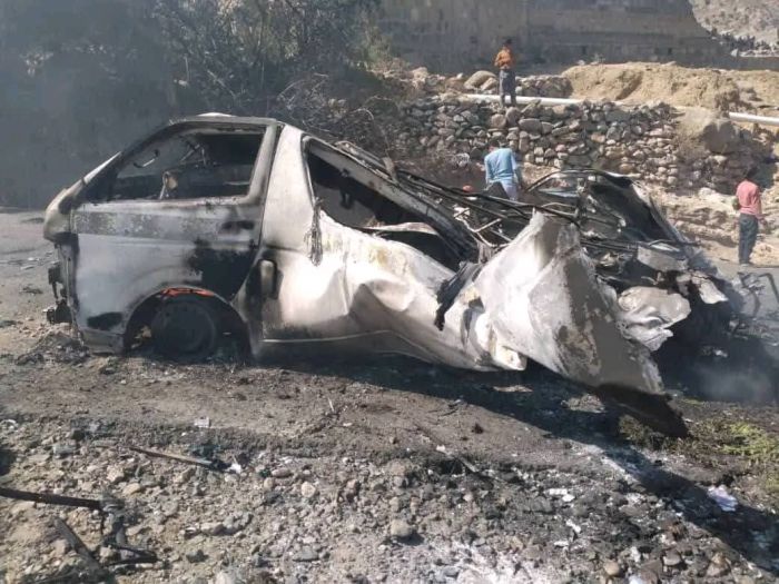 احترق باص هايس في طريق هيجة العبد بمديرية المقاطرة محافظة تعز بشكل كامل نتيجة انفجار خزان الوقود.