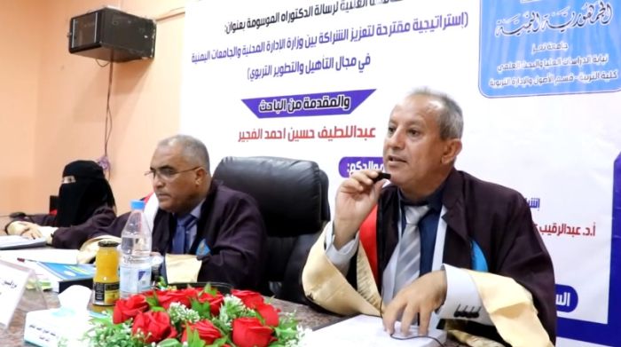 منحت جامعة تعز، ممثلة بكلية التربية قسم الإدارة والتخطيط، الباحث عبداللطيف حسين الفجير درجة الدكتوراه بامتياز في الإدارة التربوية عن أطروحته الموسومة بـ "استراتيجية مقترحة لتعزيز الشراكة بين وزارة الإدارة المحلية والجامعات اليمنية في مجال التأهيل والتطوير التربوي".