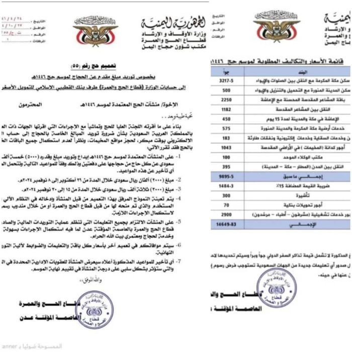 تفاجأ اليوم المواطنون الراغبون في أداء فريضة الحج بتحديد وزارة الأوقاف والإرشاد، في العاصمة المؤقتة عدن، باقة حج واحدة للموسم 1446هـ، في الوقت الذي كانت قد وعدت بتحديد أكثر من باقة في بيانها الصادر بتاريخ 1446/4/24 هـ الموافق 2024/10/27 في الفقرة 6.