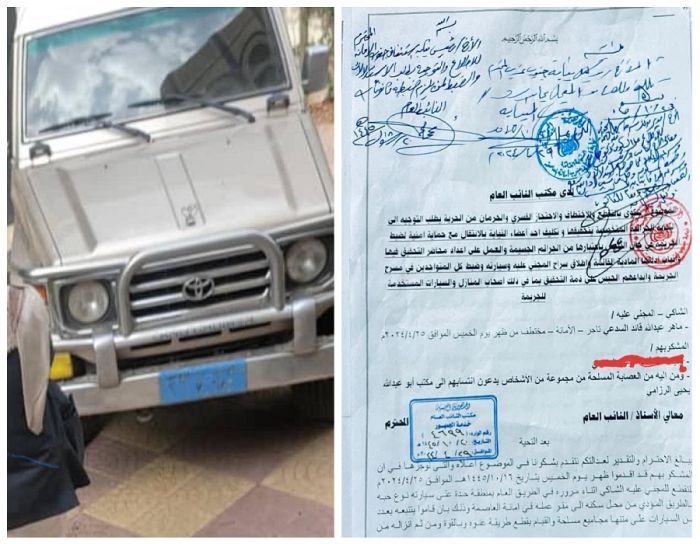 وأشار المحامي إلى أن الميليشيا استدعت التاجر السدعي عبر نافذين تابعين لمكتب القيادي الحوثي النافذ الرزامي في صنعاء، وقاموا بنهب سيارته للضغط عليه لتفويضهم في التحكيم العرفي. ولكن السدعي لم يرضخ لهم ورفض التوقيع تحت الضغط والإكراه.