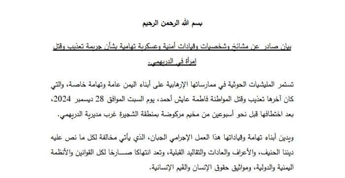 وتأتي هذه الجريمة في سياق الانتهاكات المستمرة التي تمارسها الميليشيا الإرهابية بحق أبناء الشعب اليمني، وخاصة النساء والأطفال، دون أي رادع أو احترام للقوانين الدولية والإنسانية.