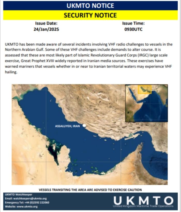 وقالت هيئة عمليات التجارة البحرية البريطانية إن ربان السفينة أبلغ عن اقتراب سفينة عسكرية صغيرة منها وكانت تطلق أشعة الليزر الخضراء باتجاه جسر السفينة.