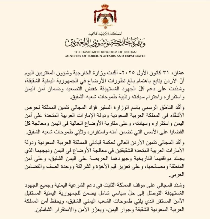 وقال الناطق الرسمي باسم الوزارة السفير فؤاد المجالي تثمين المملكة لحرص الأشقّاء في المملكة العربية السعودية ودولة الإمارات العربية المتحدة على أمن اليمن واستقراره وسيادته، وعلى مقاربة الأوضاع الحالية في اليمن ومعالجة كلّ القضايا على الأسس التي تضمن أمنه واستقراره وتلبّي طموحات شعبه الشقيق.
