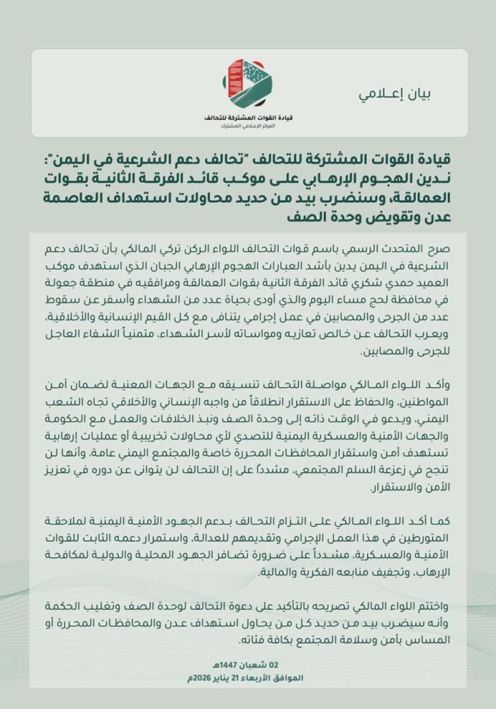 واختتم المتحدث الرسمي تصريحه بتوجيه رسالة حازمة، مؤكداً أن التحالف "سيضرب بيد من حديد" كل من يحاول استهداف العاصمة المؤقتة عدن أو المحافظات المحررة، أو يسعى للمساس بأمن وسلامة المجتمع اليمني بكافة فئاته، مشدداً على ضرورة تضافر الجهود المحلية والدولية لمكافحة الإرهاب وتجفيف منابعه الفكرية والمالية.