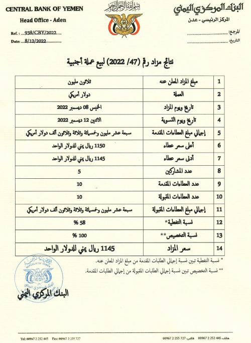 البنك المركزي يرسي مزاده السابع والأربعين عند 1145 للدولار