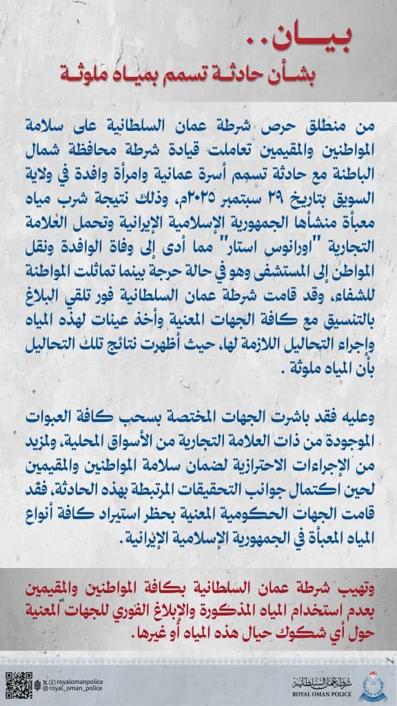سلطنة عُمان تحظر استيراد كافة أنواع المياه الإيرانية بعد حدوث حالات تسمم أت الى وفيات