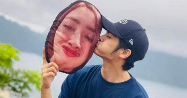 زوج يحمل وسادة عليها صورة زوجته خلال إجازته