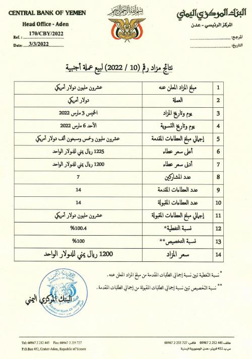البنك المركزي يعلن نتائج المزاد العاشر بسعر 1200 ريال للدولار