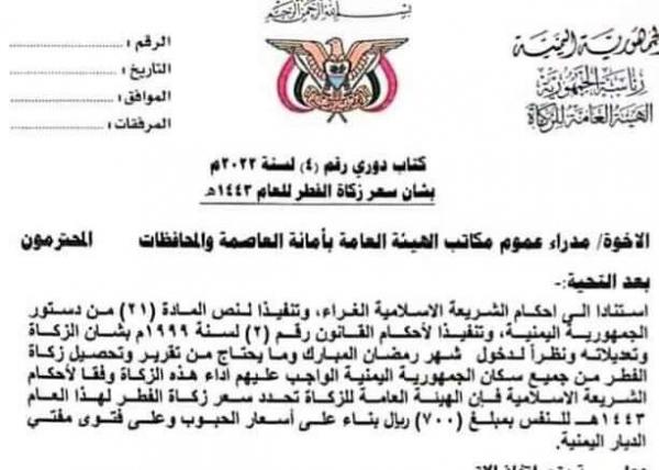 وفي مذكرة صادرة عن ما يسمى بالهيئة العامة للزكاة التابعة للميليشيا ألزمت فيها المكاتب التنفيذية وشركات القطاع العام والمختلط بخصم مبالغ زكاة النفس بمقدار 700 ريال على كل نفس، في زيادة 200 ريال عن العام الماضي.
