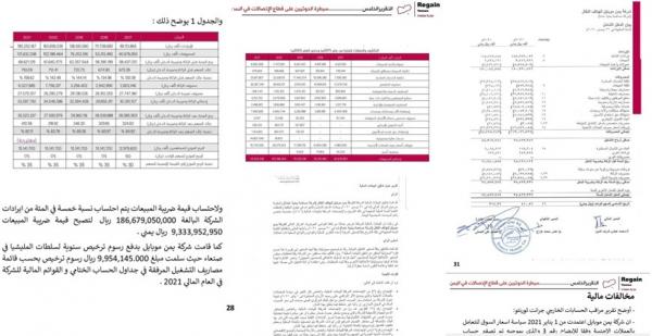 وبيّن التقرير أن إجمالي ما تحصّلت عليه الميليشيا الحوثية من أموال من شركة "يمن موبايل للهاتف النقّال" للعام المالي ٢٠٢١ بنصوص قانونية عبر مصلحة الضرائب ومصلحة الواجبات الزكوية (الهيئة العامة للزكاة التي أنشأها الحوثيون بمخالفة الدستور والقوانين النافذة) والخدمات وفوارق أسعار صرف العملات مبلغ يزيد على 83.9 مليار ريال.