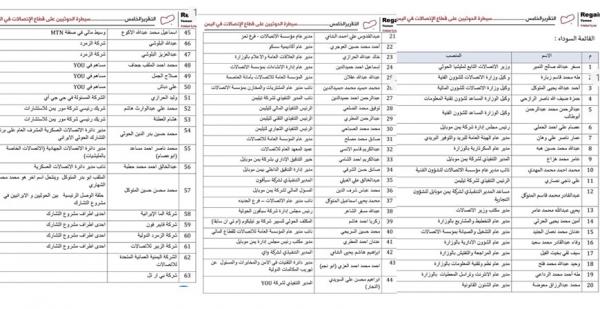وجاء على رأس القائمة وزير الاتصالات في حكومة الميليشيا (غير المعترف بها دولياً) مسفر عبد الله النمير وعدد من وكلاء ومسؤولي وزارته والشركات التابعة لها، ورئيس مجلس إدارة شركة "يمن موبايل" عصام علي الحملي والمدير التنفيذي للشركة عامر محمد هزّاع ومدير عام الهيئة العامة للبريد والتوفير البريدي عمّار ناصر وهان والرئيس التنفيذي لشركة "تيليمن" علي ناجي نصاري ونائبه عبد الرحمن أحمد حميد الدين ومدير عام المؤسّسة العامة للاتصالات السلكية واللاسلكية صادق محمد مصلح.