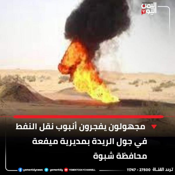 اقدم مجهولون مجهولون، اليوم الاربعاء، على تفجير أنبوب نقل النفط في منطقه جول الريدة، بمديرية ميفعة، محافظة شبوة.
