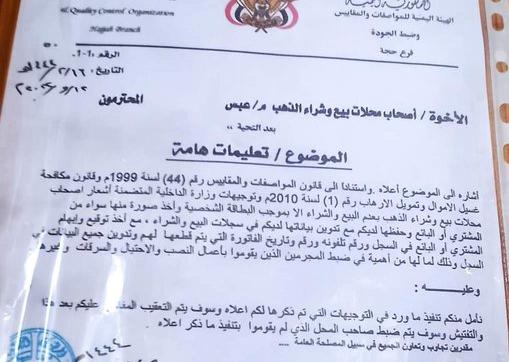 وألزمت ميليشيا الحوثي محال الذهب والمجوهرات في عبس برفع البيانات الشخصية للمشتري في خطوة يؤكد مراقبون أن تأتي في إطار فرض الجبايات ونهب المواطنين.