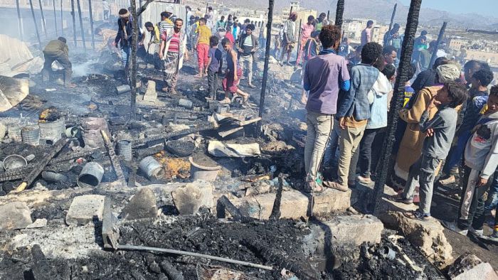 وأفادت مصادر محلية لموقع قناة اليمن اليوم، بأن ألسنة اللهب التهمت عدداً كبيراً من الخيام التي يقطنها اللاجئون، وسط حالة من الذعر والهروب الجماعي للسكان من موقع النيران.