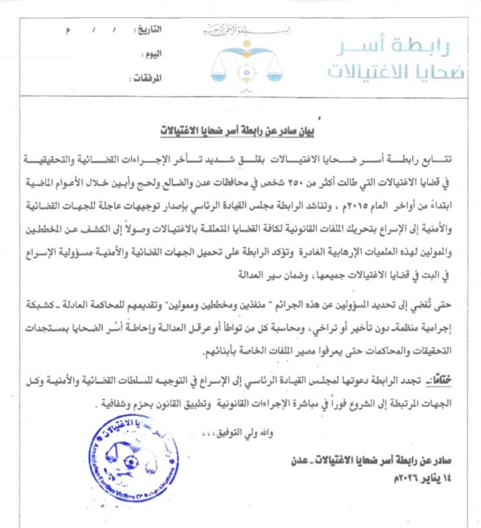 أعربت رابطة أسر ضحايا الاغتيالات عن قلقها الشديد إزاء استمرار تأخر الإجراءات القضائية والتحقيقية في قضايا الاغتيالات التي طالت أكثر من 250 شخصاً في محافظات عدن والضالع ولحج وأبين، منذ أواخر عام 2015، معتبرة أن هذا التأخير يعيق تحقيق العدالة ويضاعف معاناة أسر الضحايا.